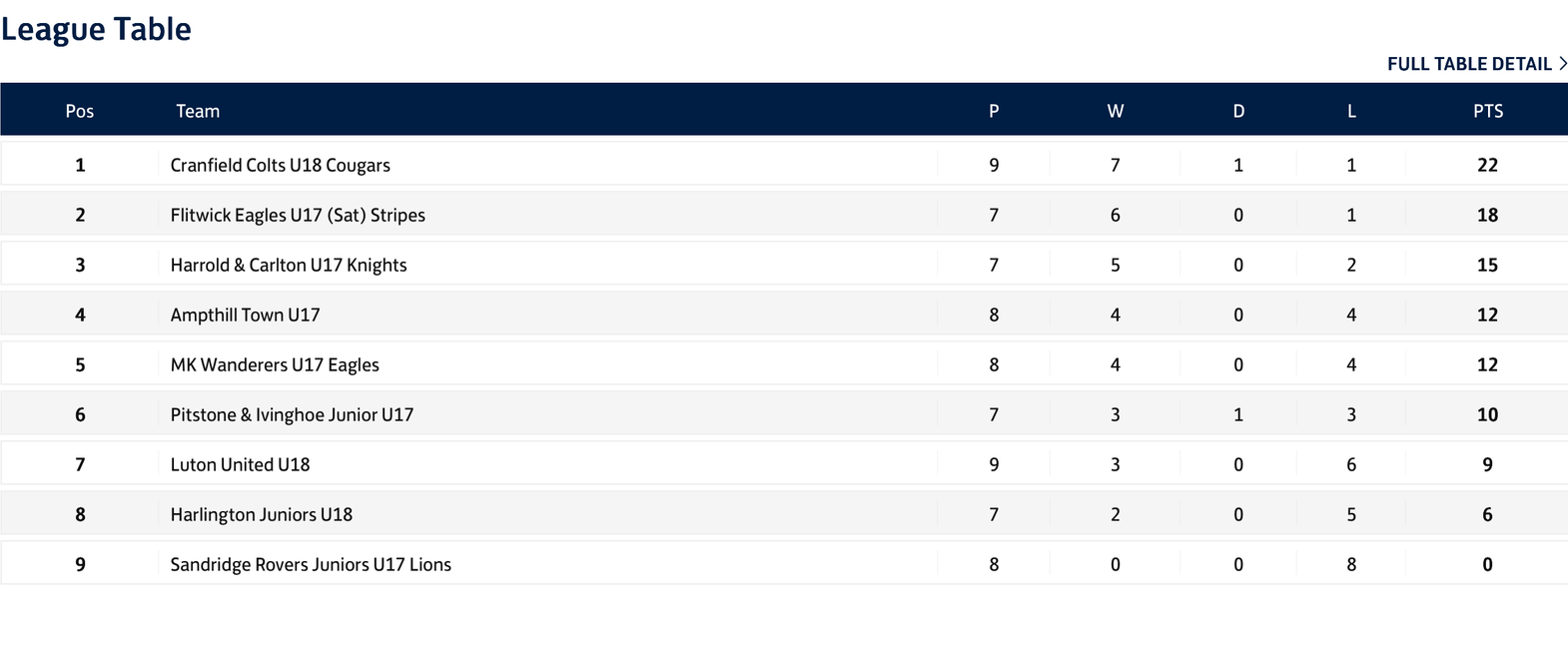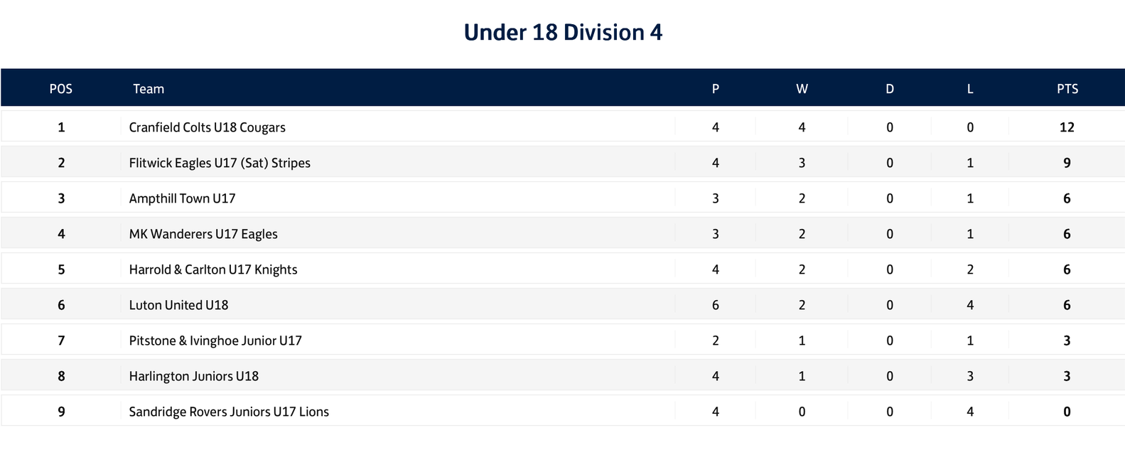 u18's League table
